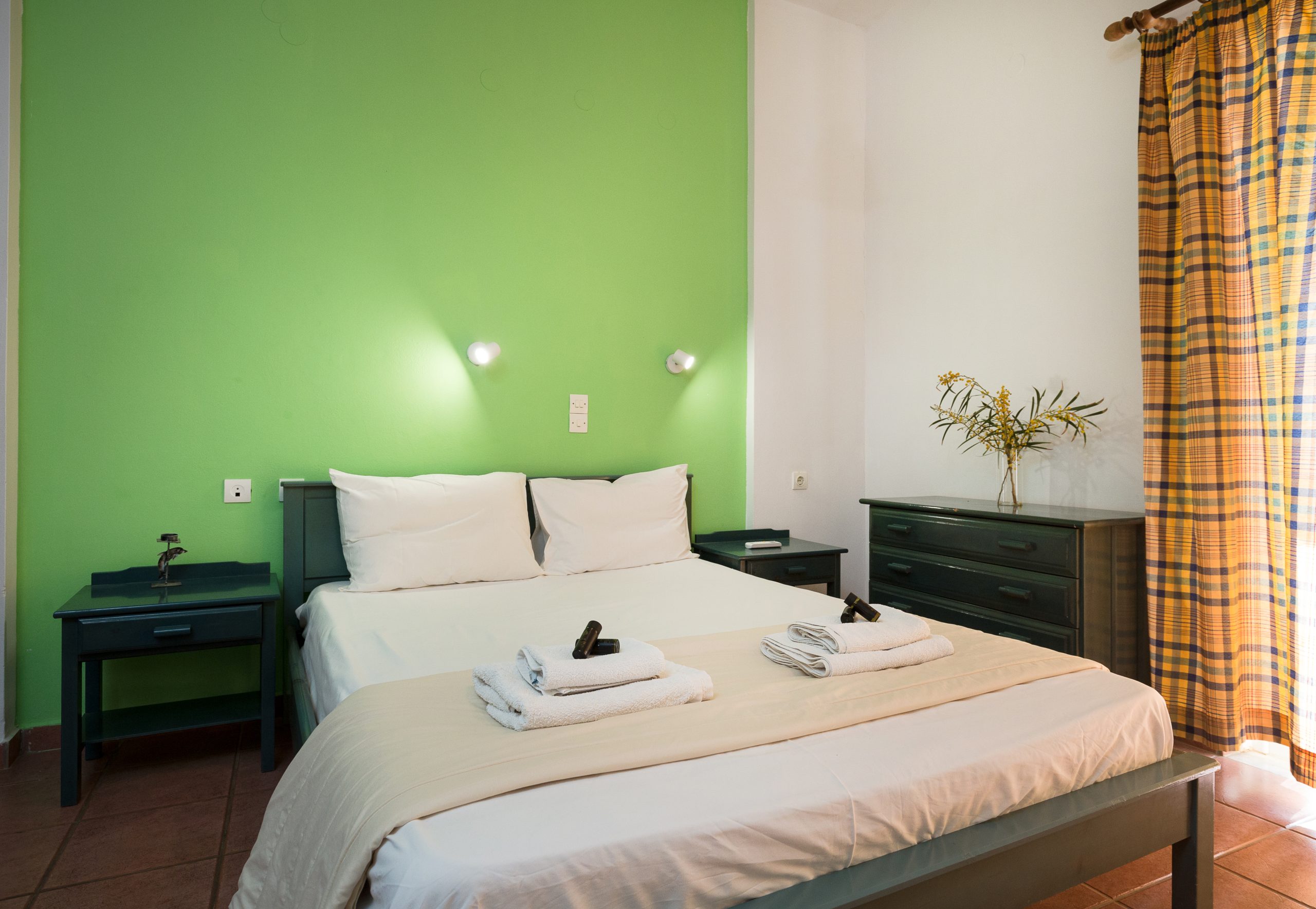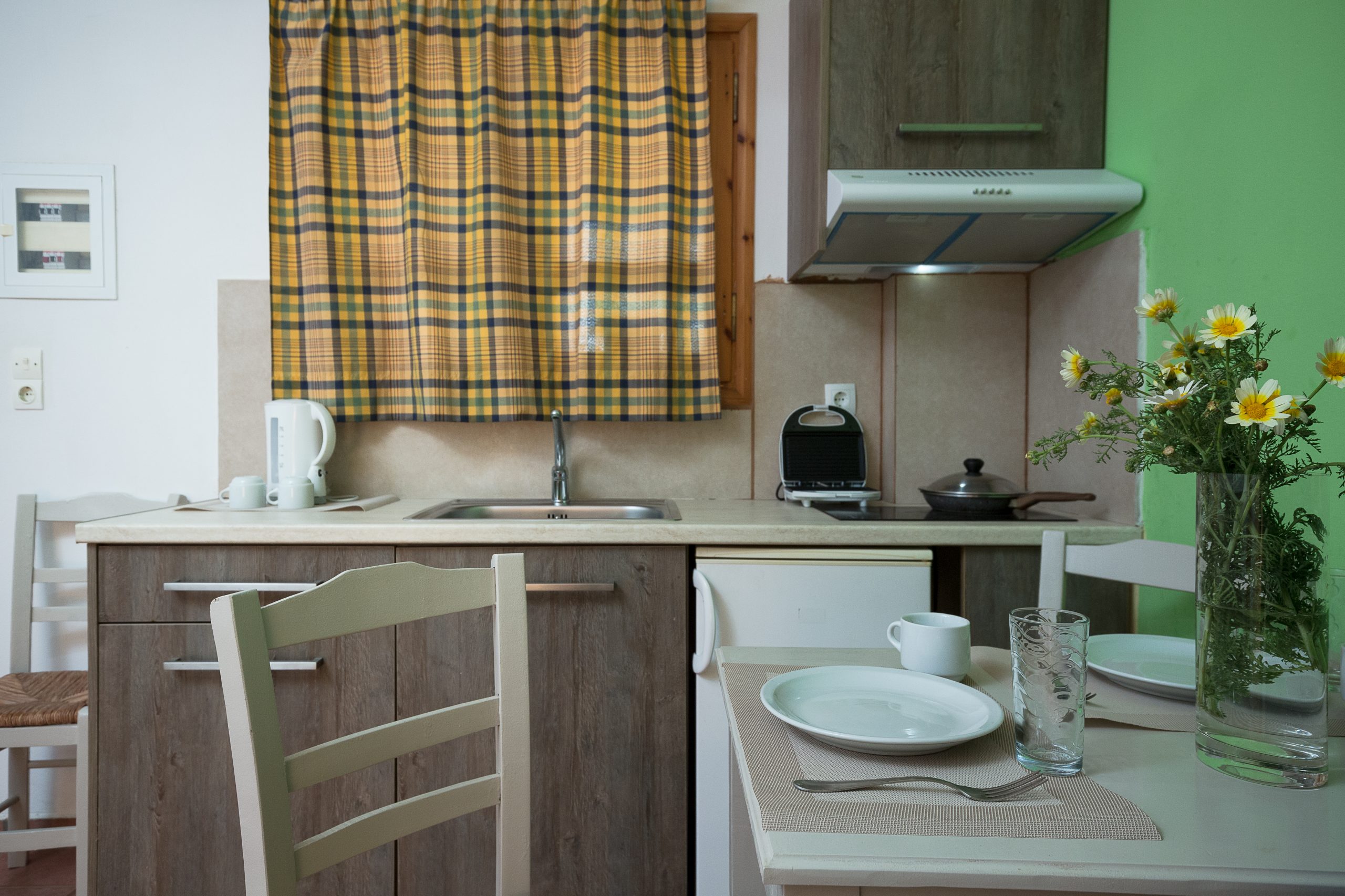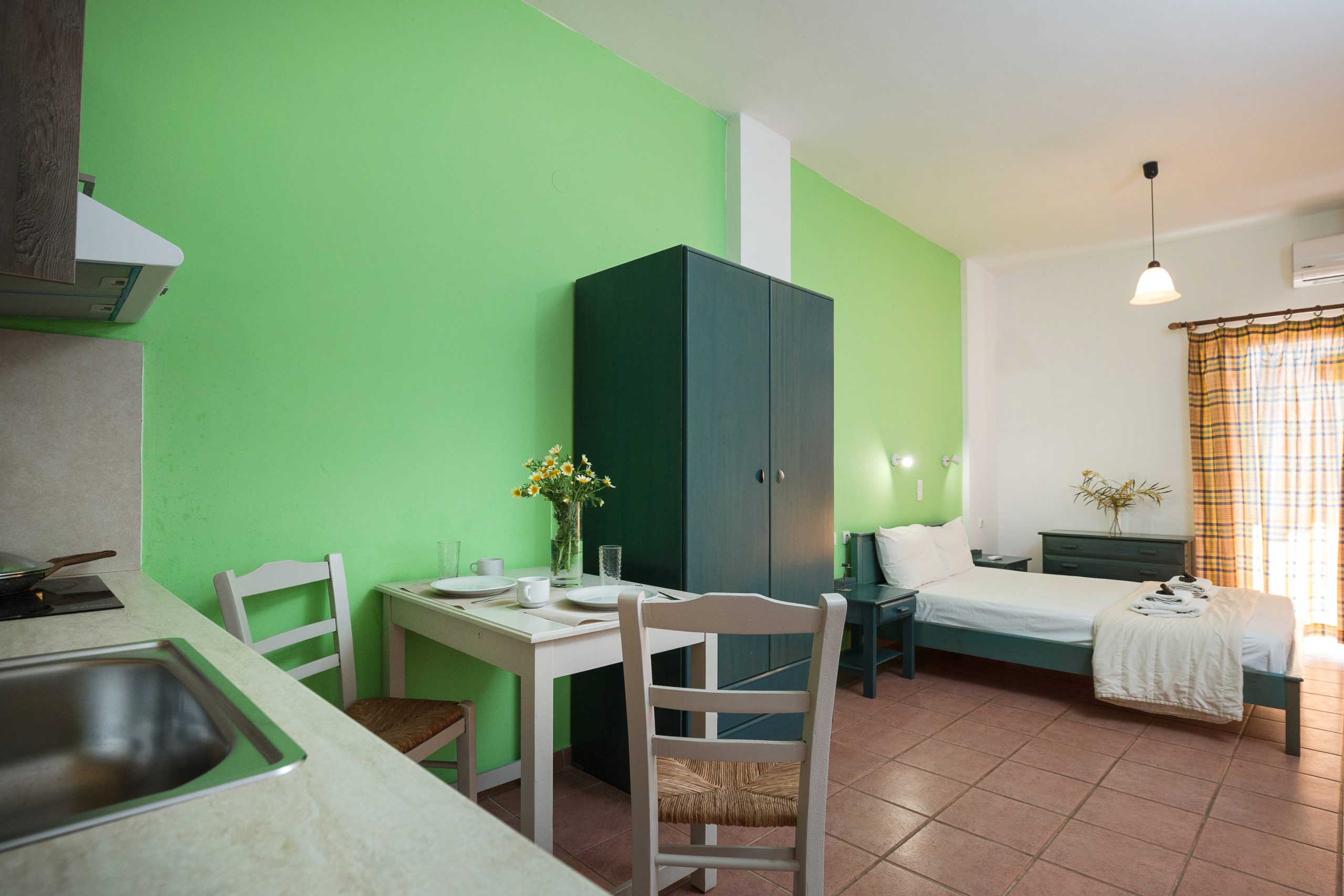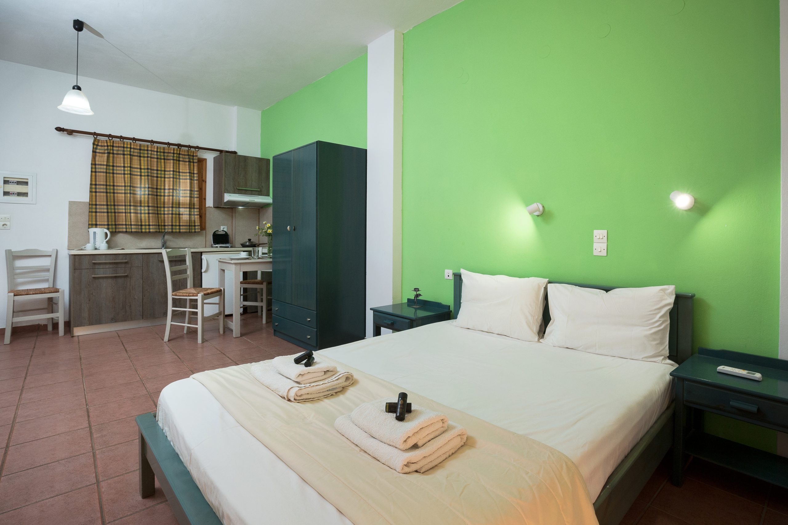 Comfortable studio apartment, ideal for couples. It features a double bed, a fully equipped kitchenette for preparing breakfast or meals, a refrigerator, and air conditioning. The private bathroom includes toiletries, ensuring a comfortable and pleasant stay.